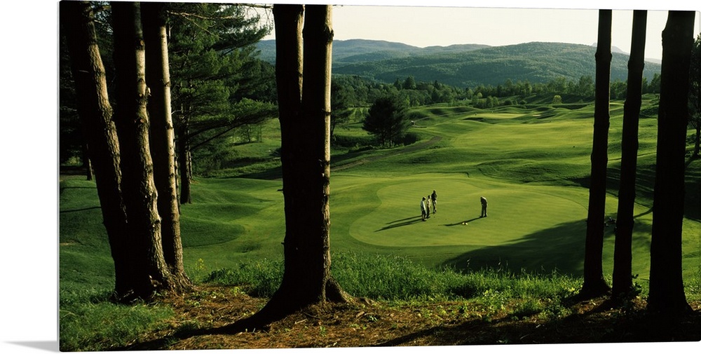 <p>A group of people are photographed putting on the green from atop a hill and looking down through trees.</p>
