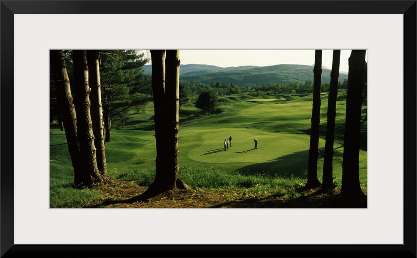 <p>A group of people are photographed putting on the green from atop a hill and looking down through trees.</p>
