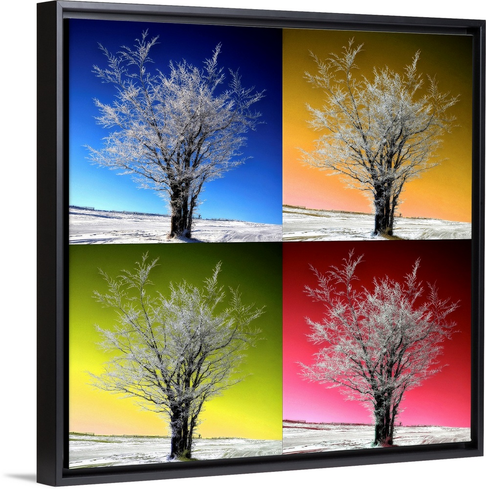 <p>This square photograph has been edited to have a pop art quality of a tree with a different color background depicting different seasons.</p>