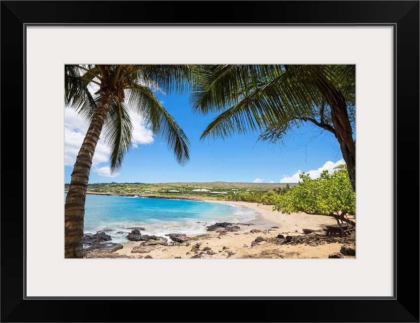 <p>Four Seasons Resort overlooking the golden beach and palm trees at Hulopo'e Beach Park; Lanai, Hawaii, United States of America</p>