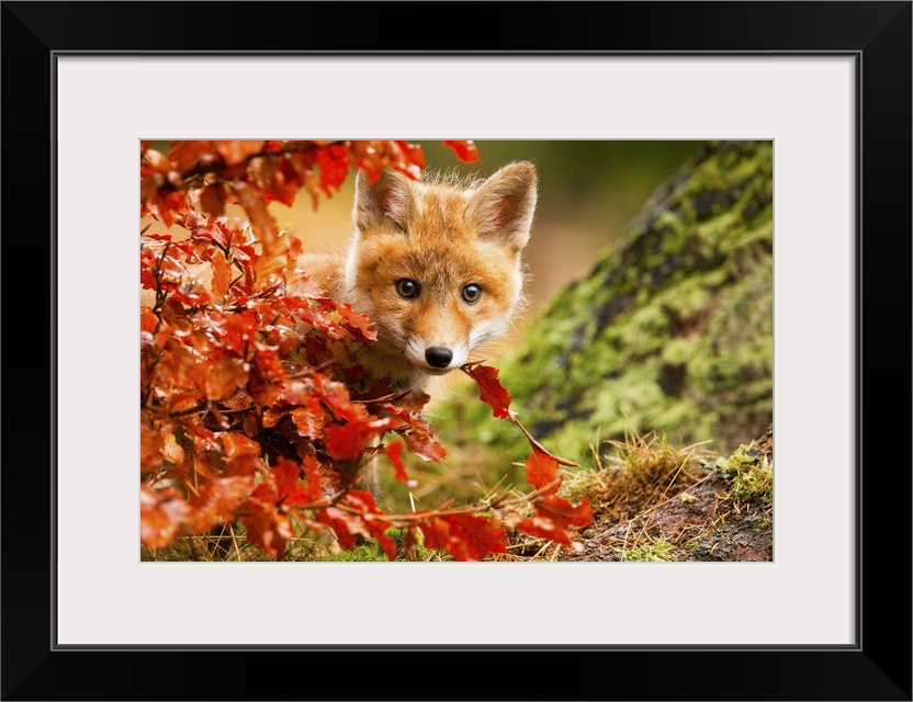 <p>Adorable red fox kit peeking out from behind a bush with red leaves.</p>