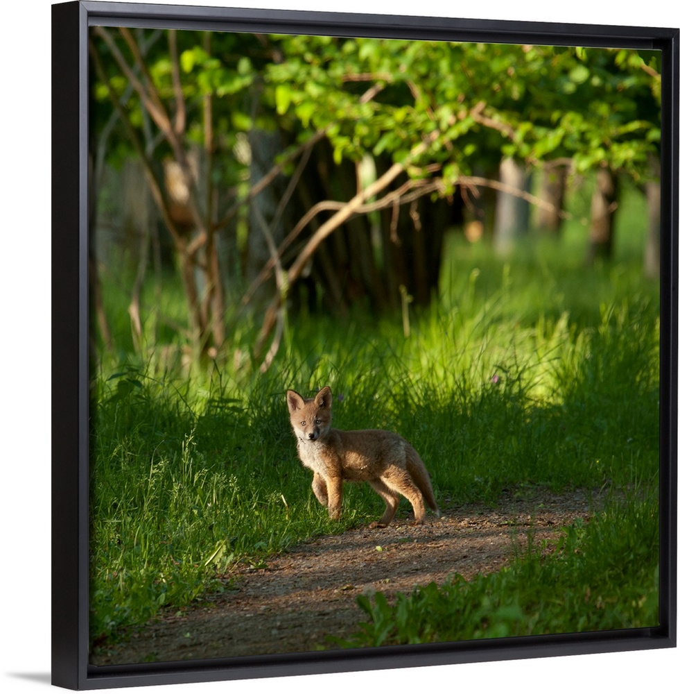 <p>A young fox stops on a path in the forest, barely taller than the grass around it.</p>