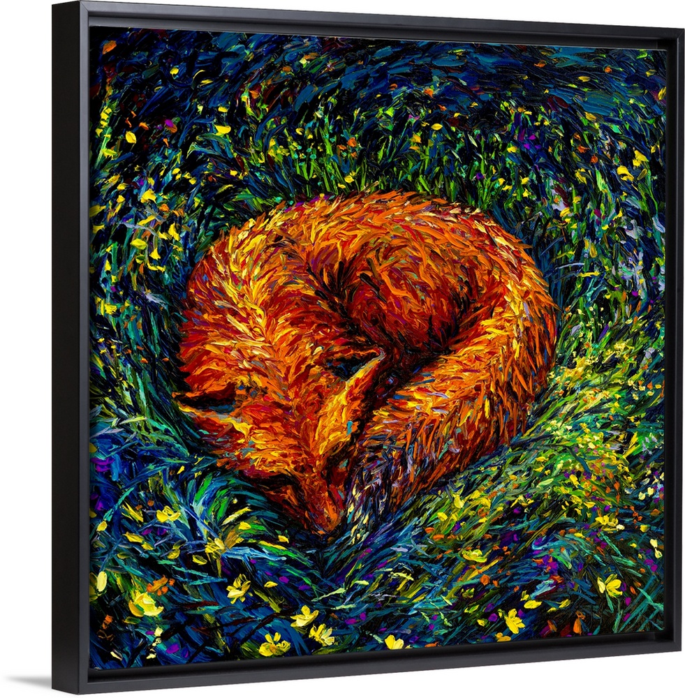 <p>Brightly colored contemporary artwork of a fox napping in the grass.</p>