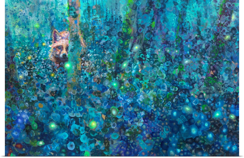 <p>Brightly colored contemporary artwork of a fox in a forest watching fireflies.</p>