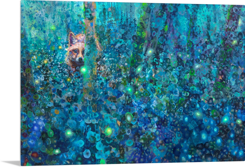 <p>Brightly colored contemporary artwork of a fox in a forest watching fireflies.</p>