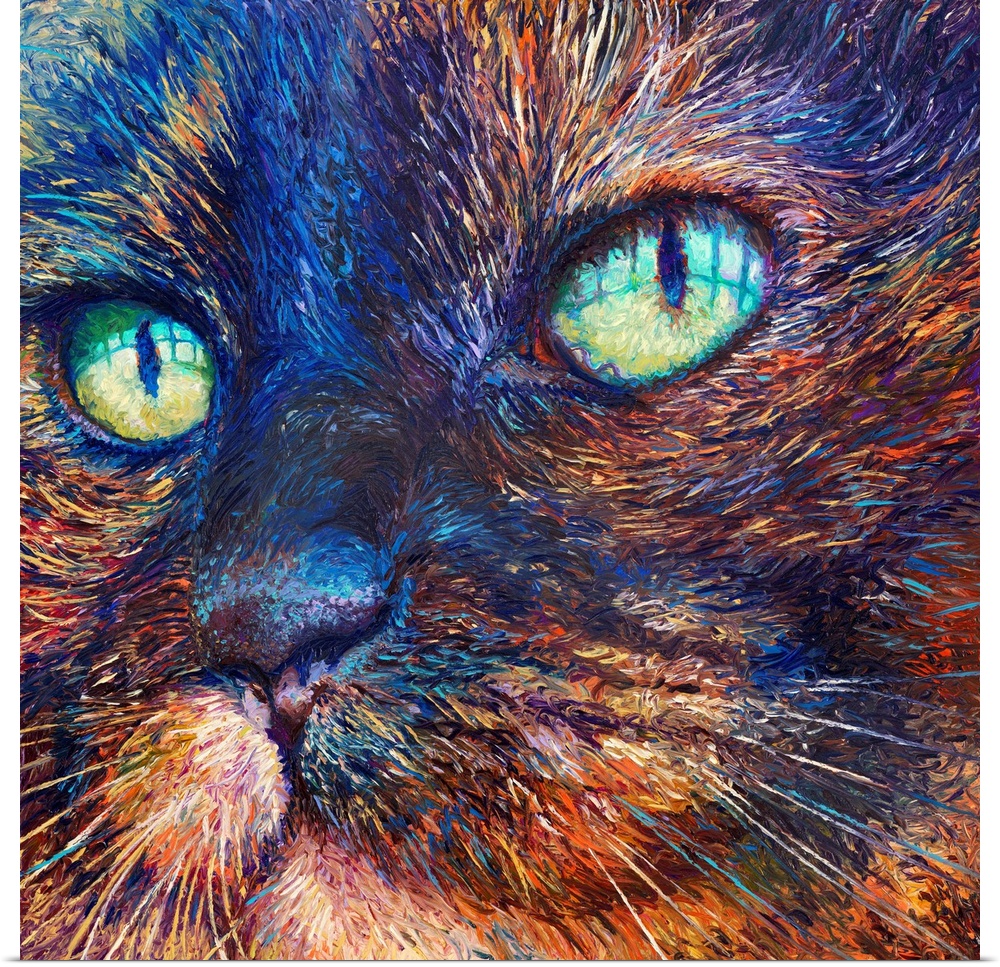<p>Brightly colored contemporary artwork of a close up of a cat.</p>