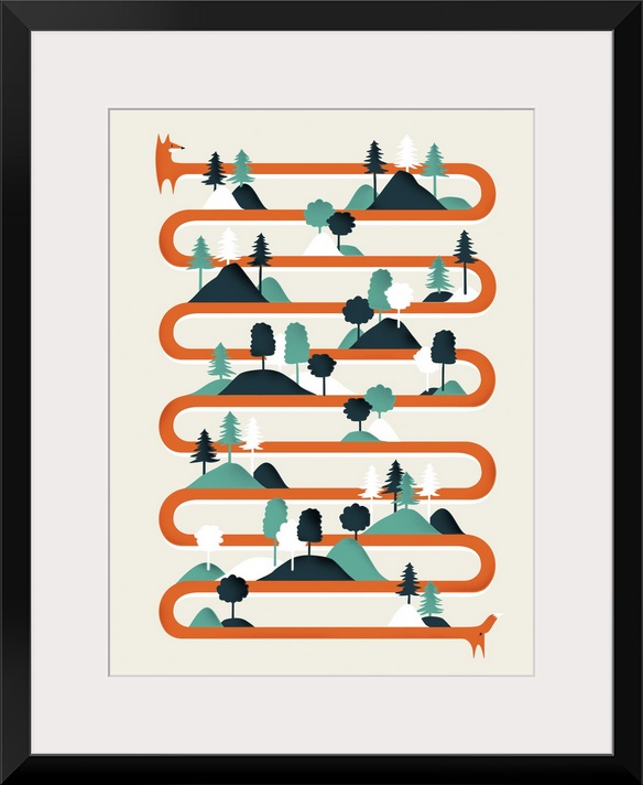 <p>Cute pop art of a fox wit ha long winding body, with hills and trees.</p>
