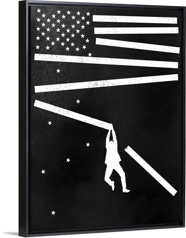 <p>Silhouette of a figure hanging from the bars of an American flag falling apart.</p>