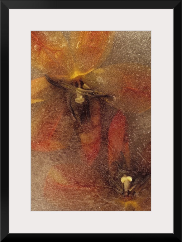 <p>Two red and yellow tulip flowerheads lying open but trapped in sheet of ice</p>
