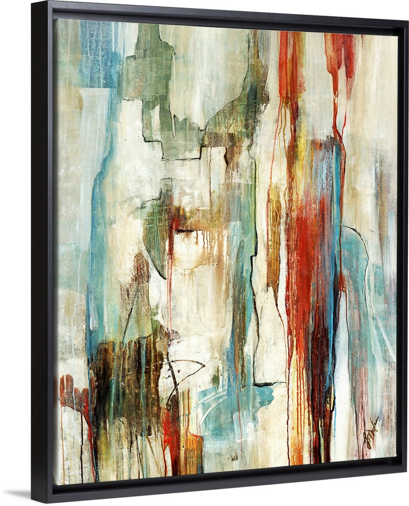 <p>A large abstract piece with muted colors that move in a vertical direction and drip down toward the bottom.</p>