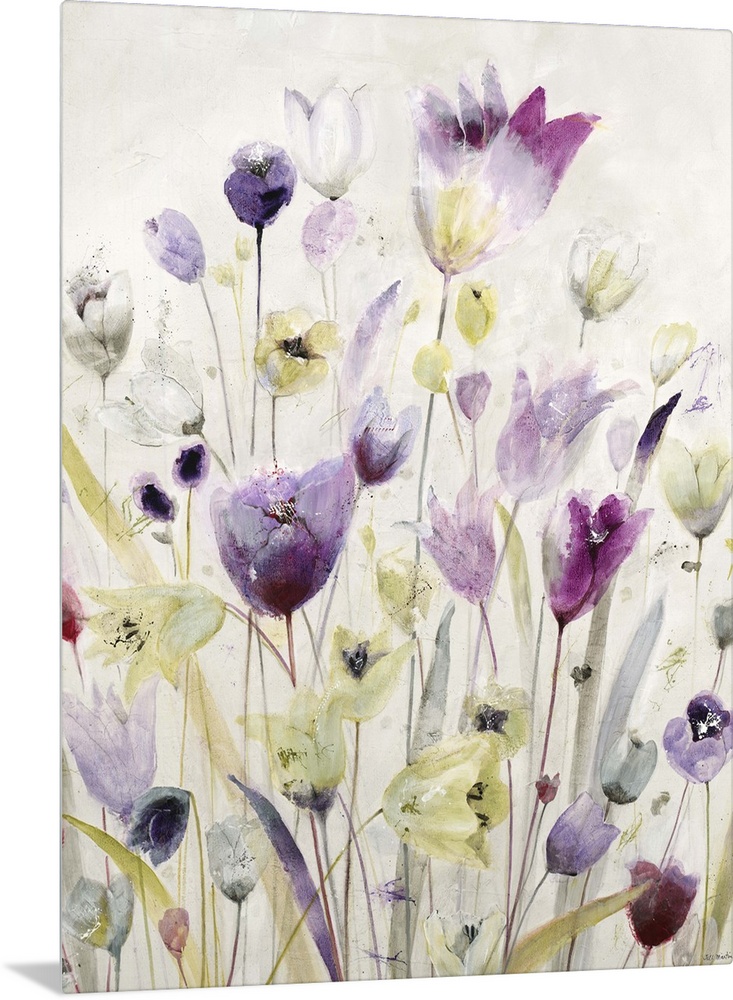 <p>Contemporary painting of pink and purple garden flowers.</p>