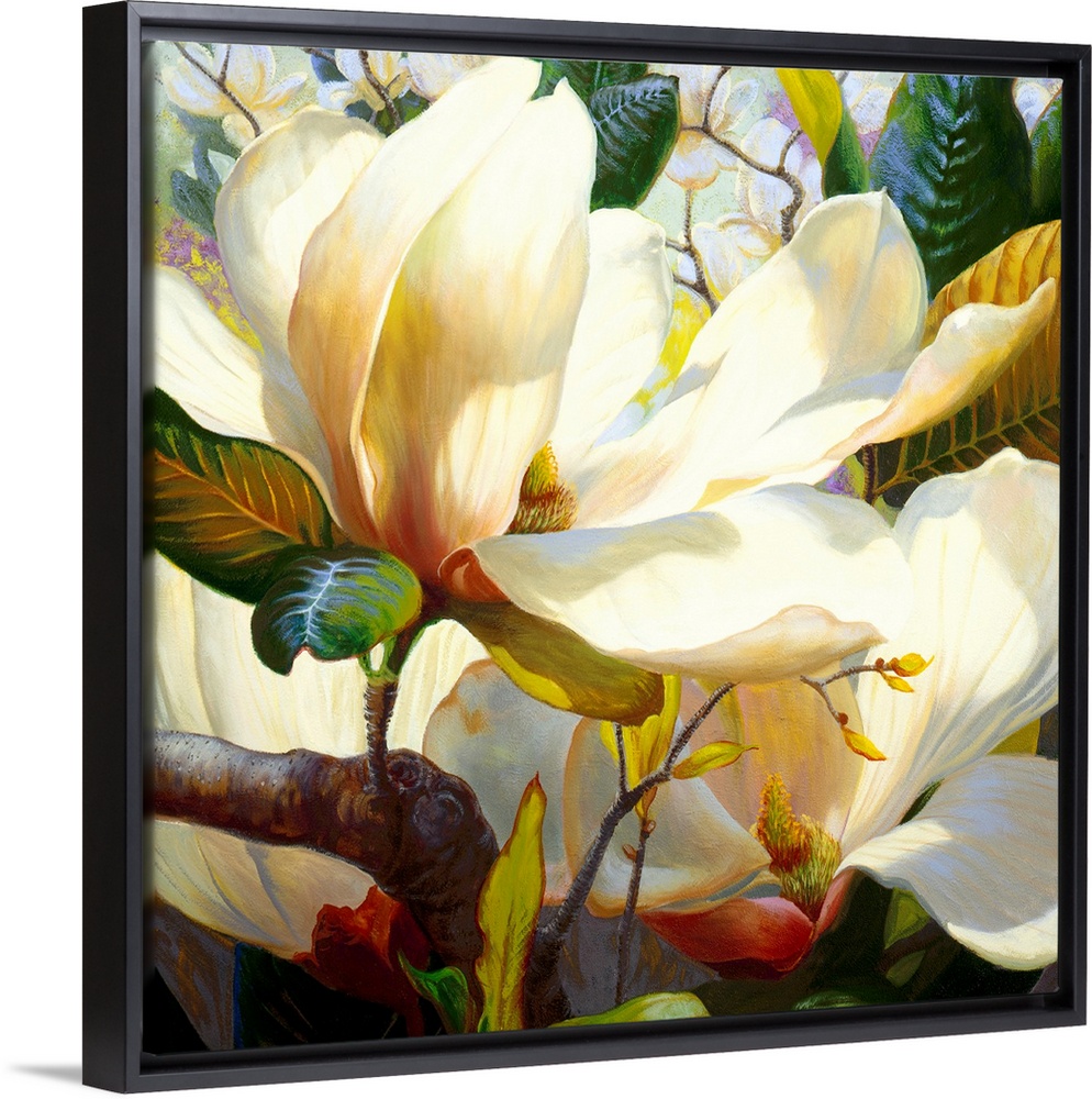 <p>A square shaped painting that is a realistic rendering of magnolia blossoms and leaves in the bright sunlight.</p>