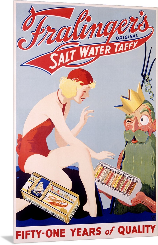 <p>This retro, vertical wall art that would look great in a kitchen or a beach house is an advertising illustration of a woman in a retro swim suit reaching for candies presented by a somewhat lecherous caricature of Poseidon, king of the sea.</p>