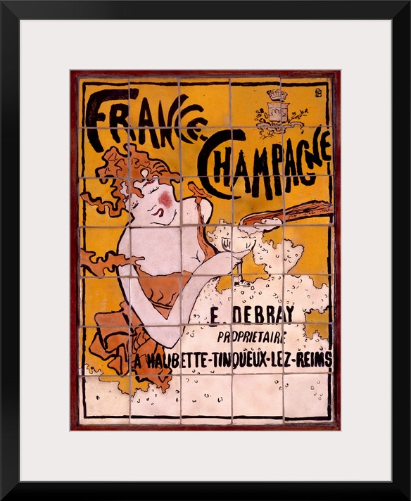 <p>Antiqued poster print advertising champagne with a painting of a woman with a wine glass.</p>