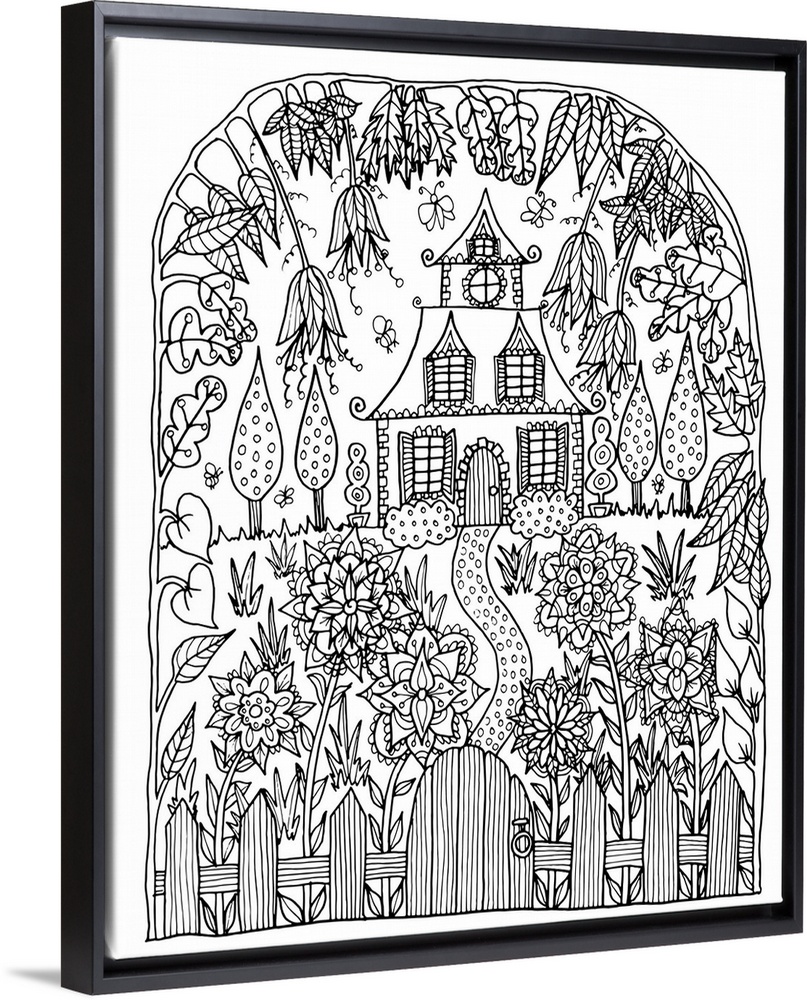 <p>Line art of a house with a large garden, surrounded by flowers.</p>