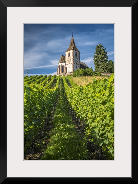 <p>France, Grand Est, Haut-Rhin, Alsatian Wine Route, Route des Vins d'Alsace, Hunawihr, A view up through a vineyard to the Eglise Saint-Jacques-le-Majeur of Hunawihr, Alsace.</p>