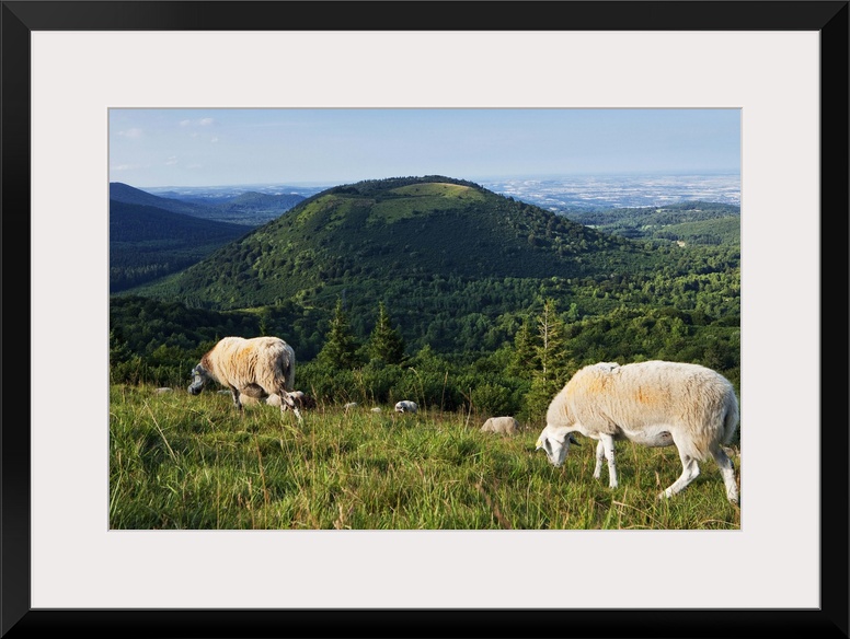 <p>France, Auvergne, Puy-de-Dome, Puy Chain, sheep grazing on top of Puy de Pariou with a volcano in the background.</p>