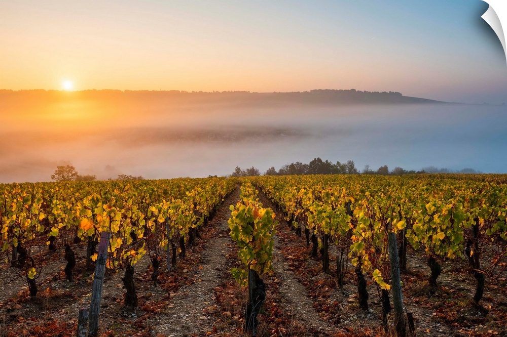 <p>France, Bourgogne-Franche-Comte, Burgundy, Yonne, Irancy. Vineyards at sunrise.</p>