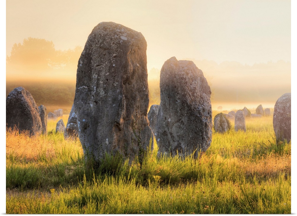 <p>France, Brittany, Morbihan, Carnac, megalithic menhir alignments of Menec in fog.</p>