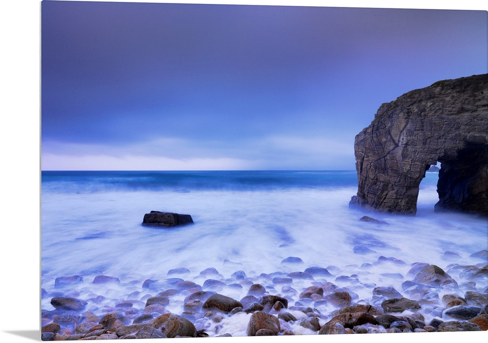 <p>France, Brittany, Morbihan, Cote Sauvage, Quiberon Peninsula, The Arch at Port Blanc under stormy sky.</p>