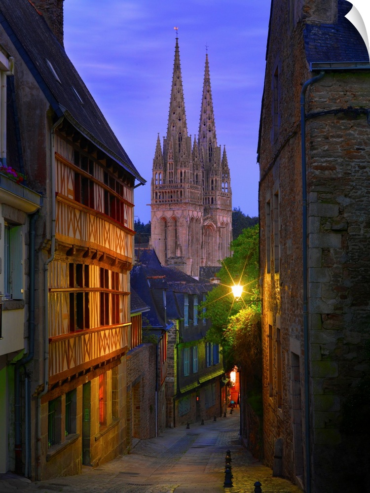 <p>France, Brittany, Finistere, Quimper, view down cobbled street to Saint Corentin cathedral at dusk.</p>