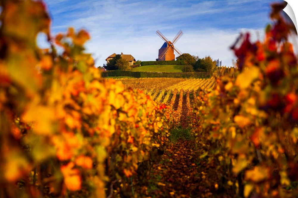 <p>France, Champagne-Ardenne, Verzenay, Vineyards and windmill in autumn.</p>