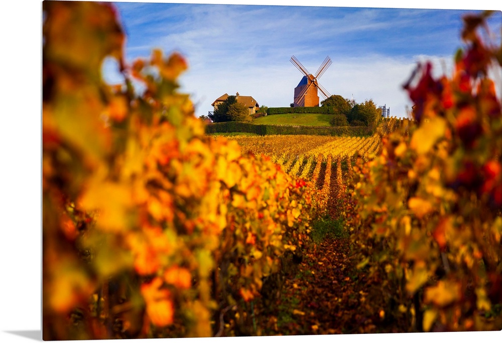 <p>France, Champagne-Ardenne, Verzenay, Vineyards and windmill in autumn.</p>