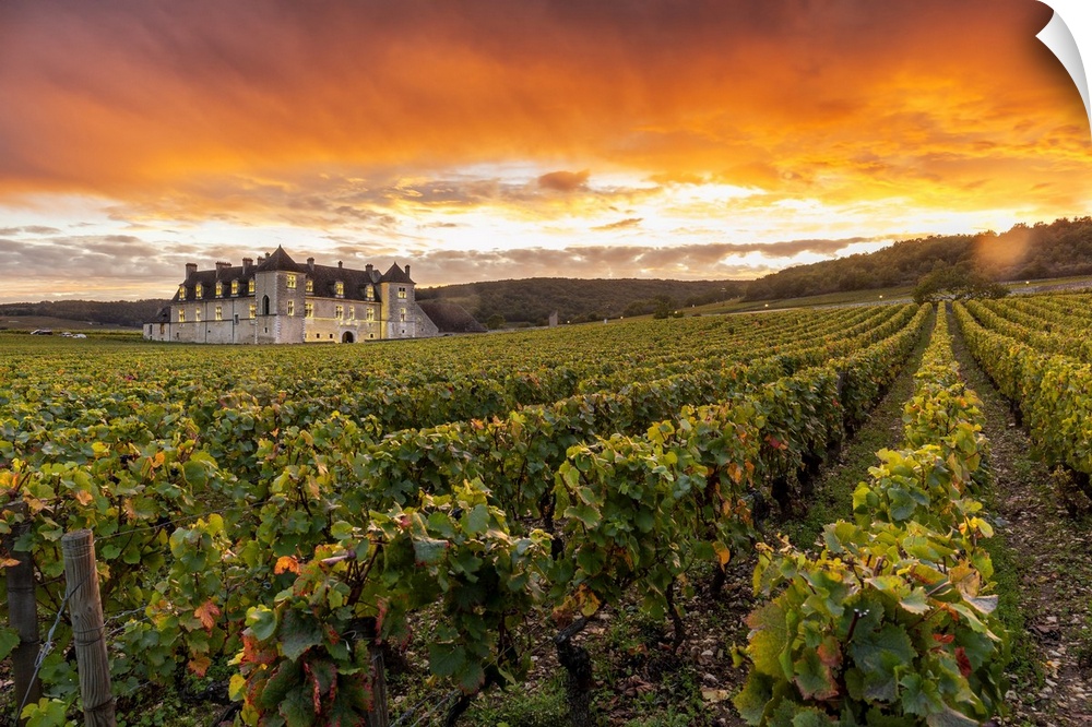<p>France, Bourgogne-Franche-Comto, Cote-d'Or, Vougeot, Chateau Clos de Vougeot & its vineyards along Route des Grands Crus at sunset.</p>
