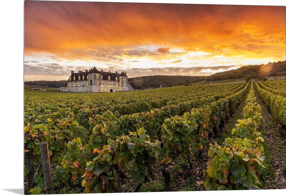 <p>France, Bourgogne-Franche-Comto, Cote-d'Or, Vougeot, Chateau Clos de Vougeot & its vineyards along Route des Grands Crus at sunset.</p>