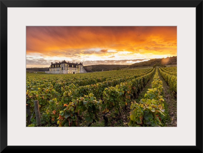 <p>France, Bourgogne-Franche-Comto, Cote-d'Or, Vougeot, Chateau Clos de Vougeot & its vineyards along Route des Grands Crus at sunset.</p>