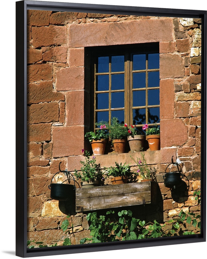 <p>Europe, France, Collognes-la-Rouge. Colorful flower pots adorn a window in this home in Collognes-la-Rouge in the Dordogne region, France.</p>
