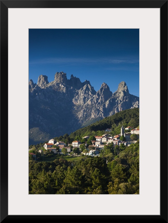 <p>France, Corsica, Corse-du-Sud Department, La Alta Rocca Region, Zonza, elevated town view with the Aiguilles de Bavella peaks</p>