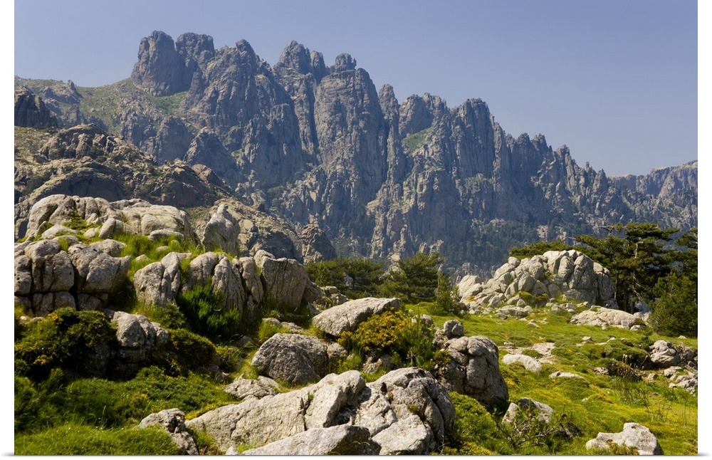 <p>Corsica. France. Europe. Granite boulders, gorse in bloom, and pinnacles of Aiguilles de Bavella. View from above Col de Bavella.</p>