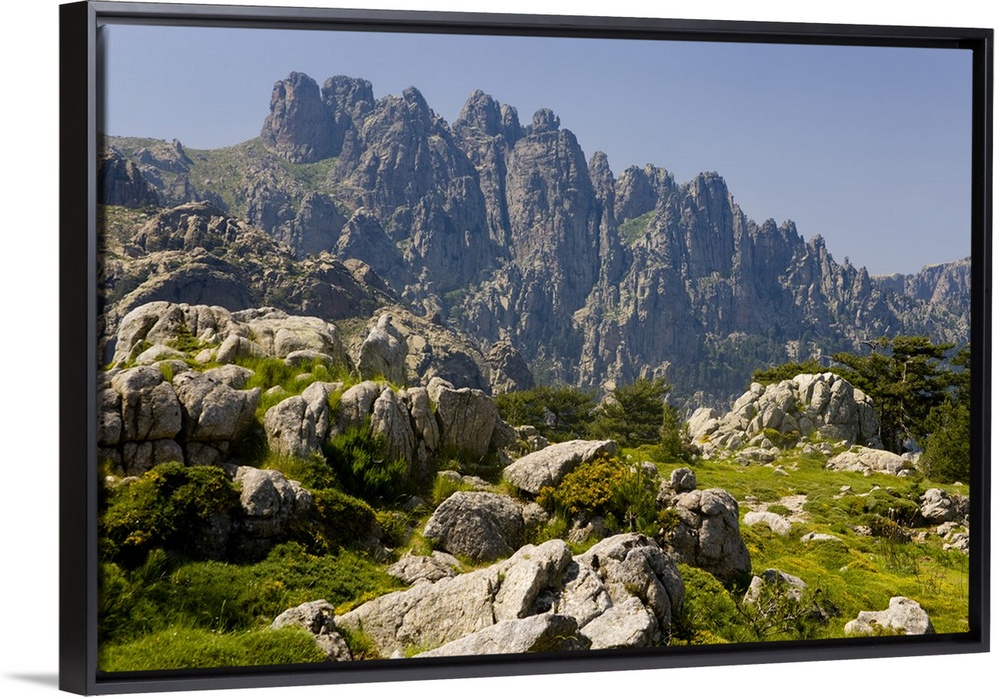 <p>Corsica. France. Europe. Granite boulders, gorse in bloom, and pinnacles of Aiguilles de Bavella. View from above Col de Bavella.</p>