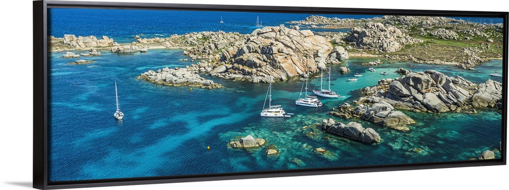 <p>France, Corsica, Parc International Marin des Bouches de Bonifacio, Lavezzi Islands, Boats at anchor, white sands in natural pools between cliffs, Strait of Bonifacio Natural Park.</p>