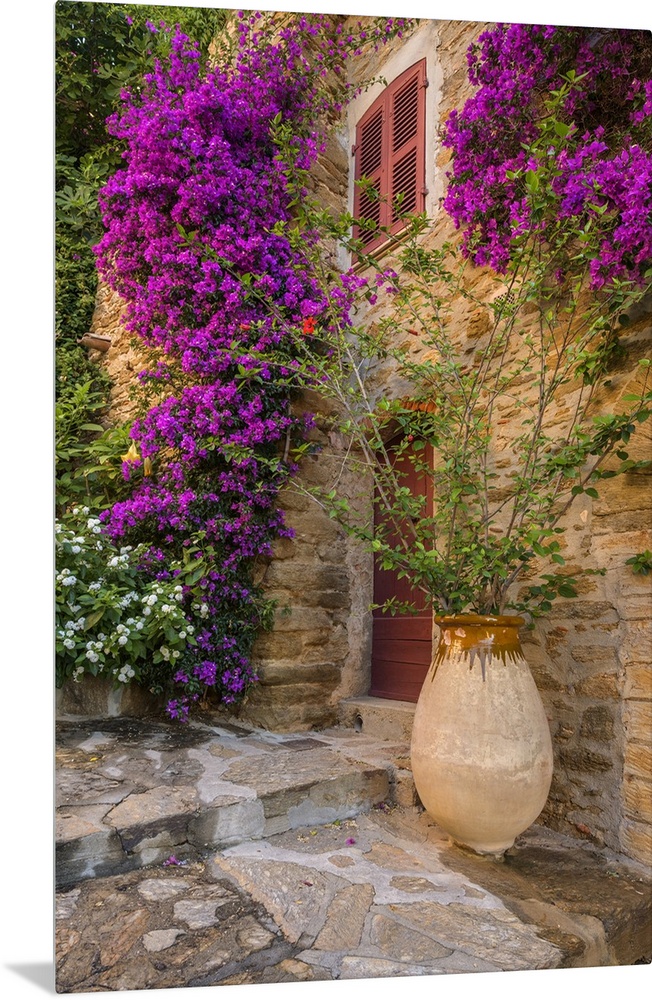 <p>France, Provence-Alpes-Cote d'Azur, Bormes-les-Mimosas, Cote d'Azur, French Riviera, Var, House entrance with blooming bougainvillea in an alley.</p>