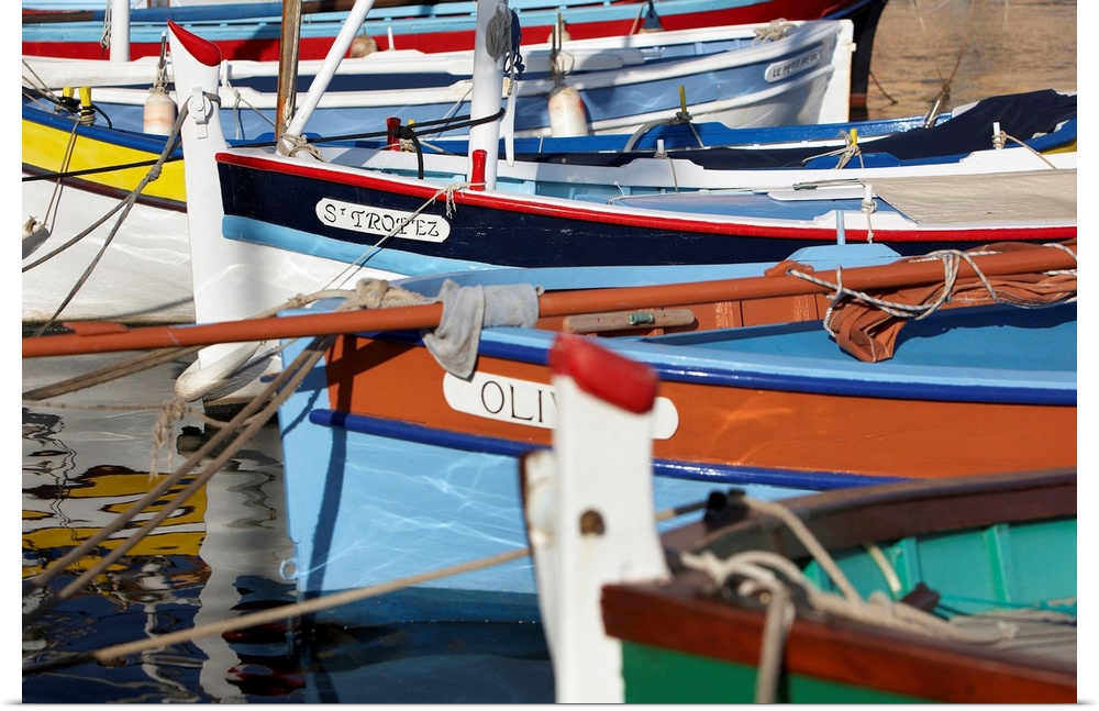 <p>France, Cote d'Azur, Saint-Tropez, Traditional fishing boats in the harbor.</p>