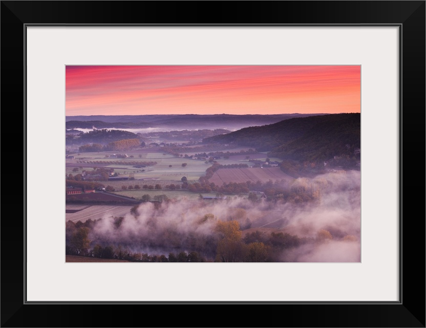 <p>France, Aquitaine Region, Dordogne Department, Domme, elevated view of the Dordogne River Valley in fog from the Belvedere de la Barre, dawn</p>