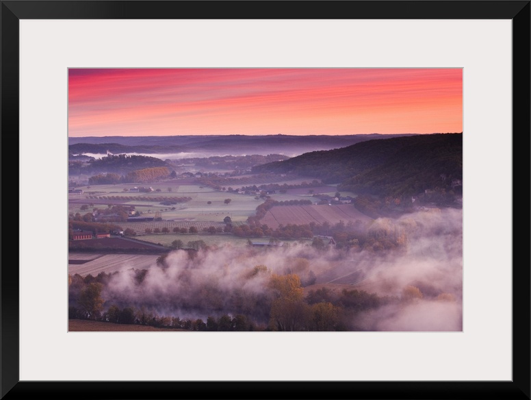 <p>France, Aquitaine Region, Dordogne Department, Domme, elevated view of the Dordogne River Valley in fog from the Belvedere de la Barre, dawn</p>
