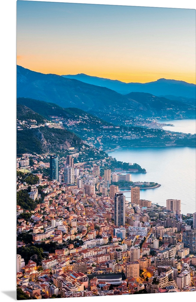 <p>France, Provence-Alpes-Cote d'Azur, French Riviera, Alpes-Maritimes, Principality of Monaco. Monaco skyline at sunrise from the Tete de Chien.</p>