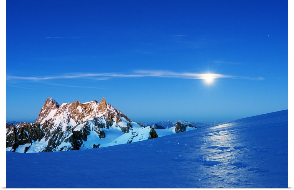 <p>Europe, France, Haute Savoie, Rhone Alps, Chamonix, moon rise over Dent du Geant and Grandes Jorasses.</p>