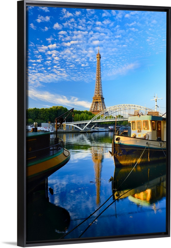 <p>France, Ile-de-France, Seine, Ville de Paris, Paris, Eiffel Tower, Barges moored along the Seine River with the Eiffel Tower and Passerelle Debilly in the background</p>