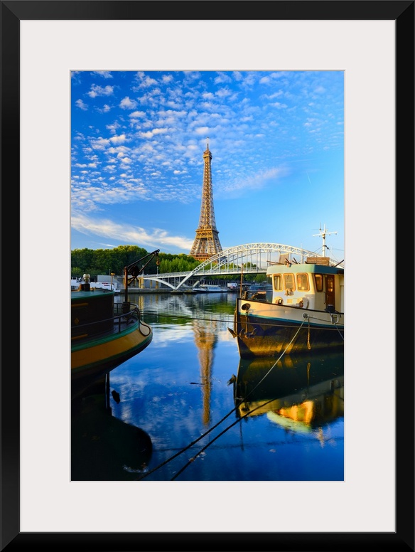 <p>France, Ile-de-France, Seine, Ville de Paris, Paris, Eiffel Tower, Barges moored along the Seine River with the Eiffel Tower and Passerelle Debilly in the background</p>