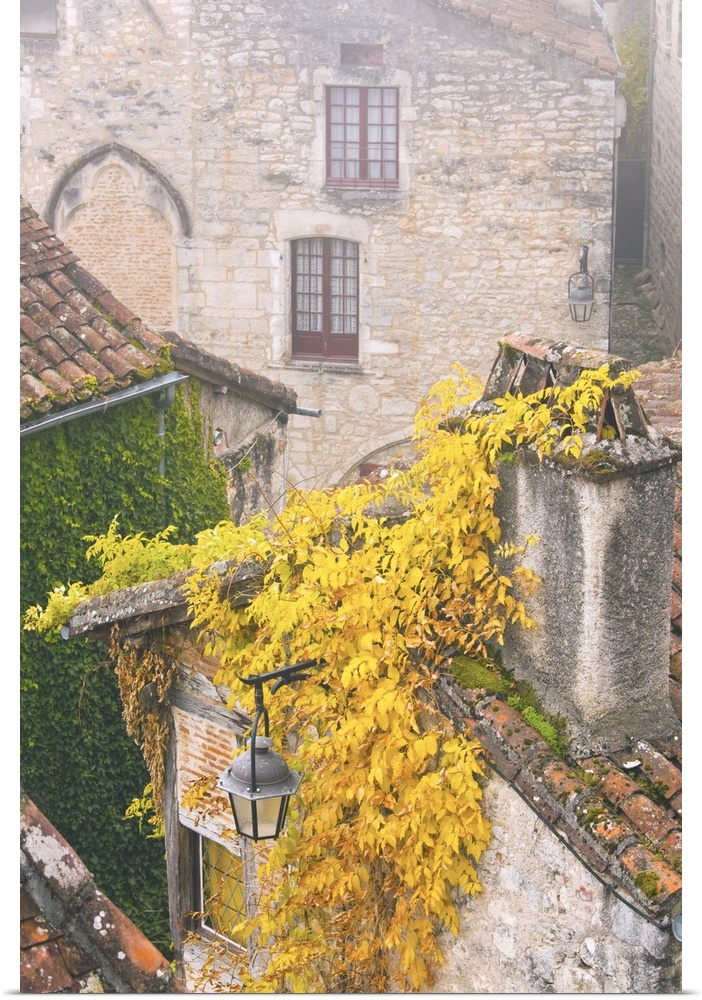 <p>France, Midi-Pyrenees Region, Lot Department, St-Cirq-Lapopie, town overview in fog</p>