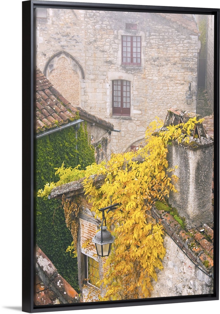 <p>France, Midi-Pyrenees Region, Lot Department, St-Cirq-Lapopie, town overview in fog</p>