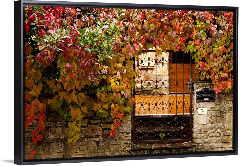 <p>France, Midi-Pyrenees Region, Tarn Department, Cordes-sur-Ciel, gate with autumn foliage</p>