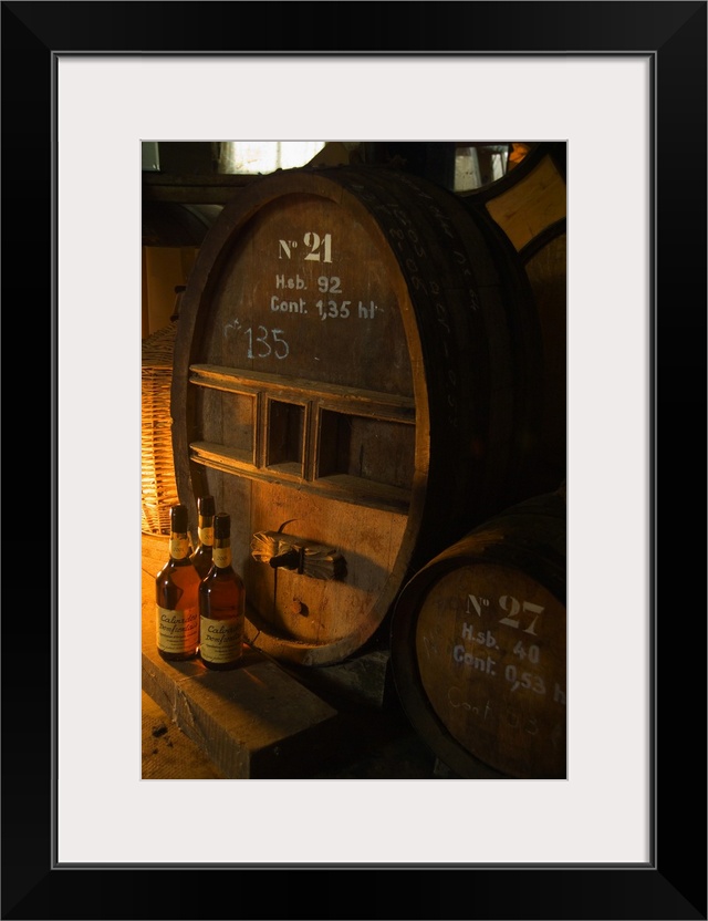 <p>France, Normandy, Normandie, Barrels and bottlesn of Calvados in a producer's cellar</p>