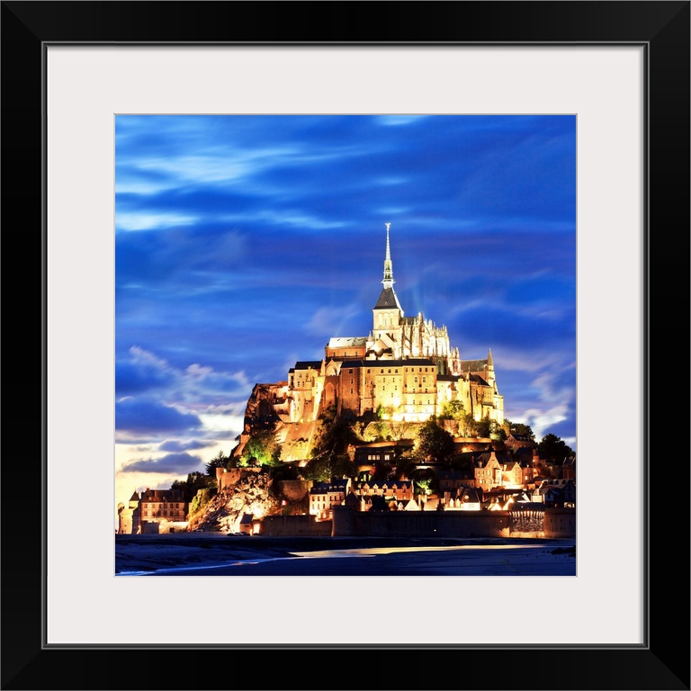 <p>France, Normandy, Atlantic ocean, English Channel, Basse-Normandie, Mont Saint-Michel, Mont St-Michel, The abbey illuminated at dusk.</p>