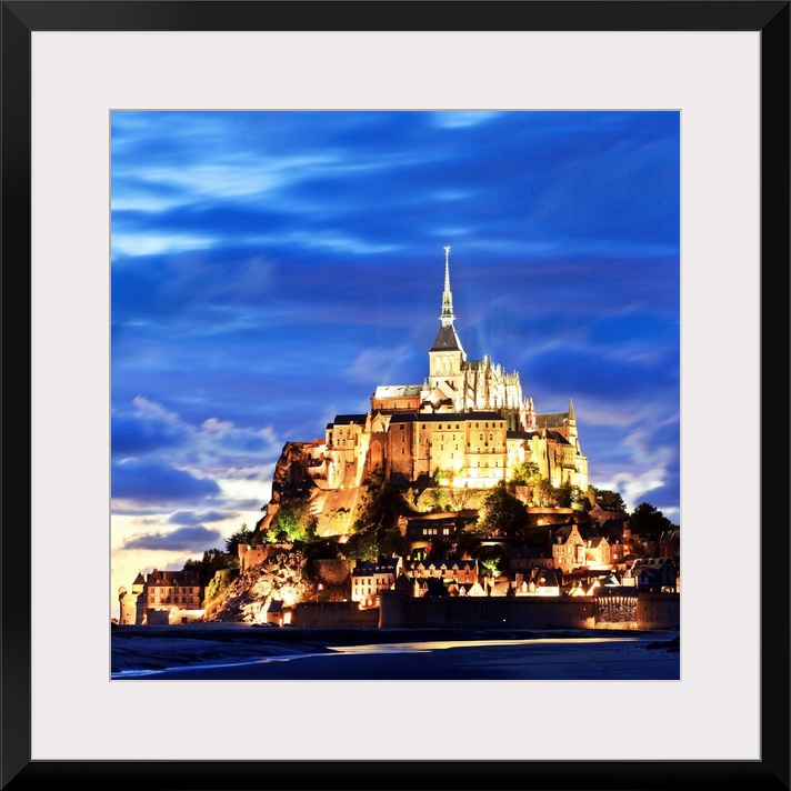 <p>France, Normandy, Atlantic ocean, English Channel, Basse-Normandie, Mont Saint-Michel, Mont St-Michel, The abbey illuminated at dusk.</p>