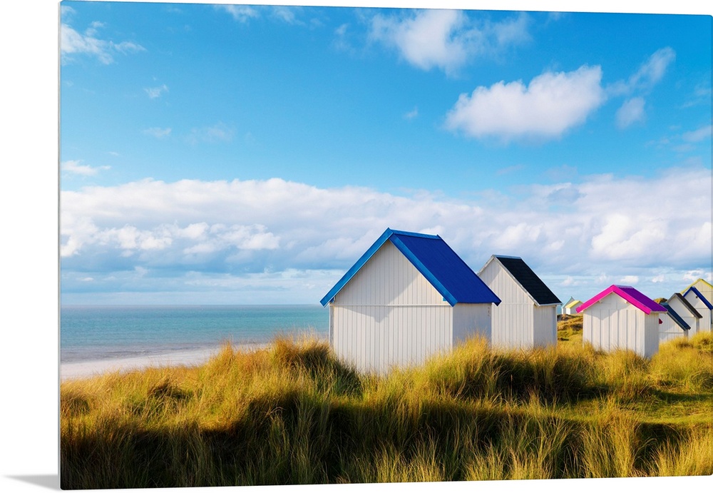 <p>France, Normandy, Gouville Sur Mer, colourful beach huts.</p>